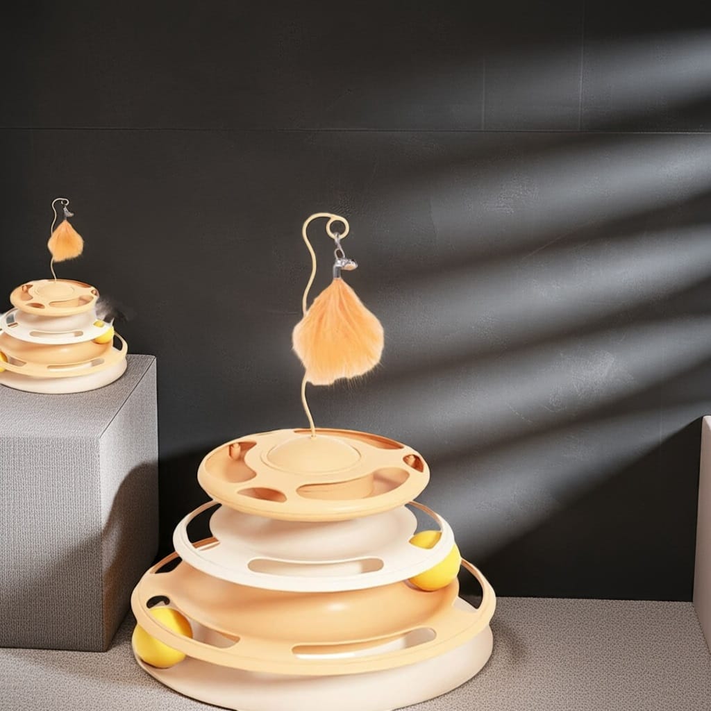 If your cat loves to play, the Tower Toy Cats is the perfect choice! This circular toy has three colorful levels, and each level has a rolling ball. When your cat hits the ball, it spins around the track. This action keeps your cat busy, active, and happy for hours.